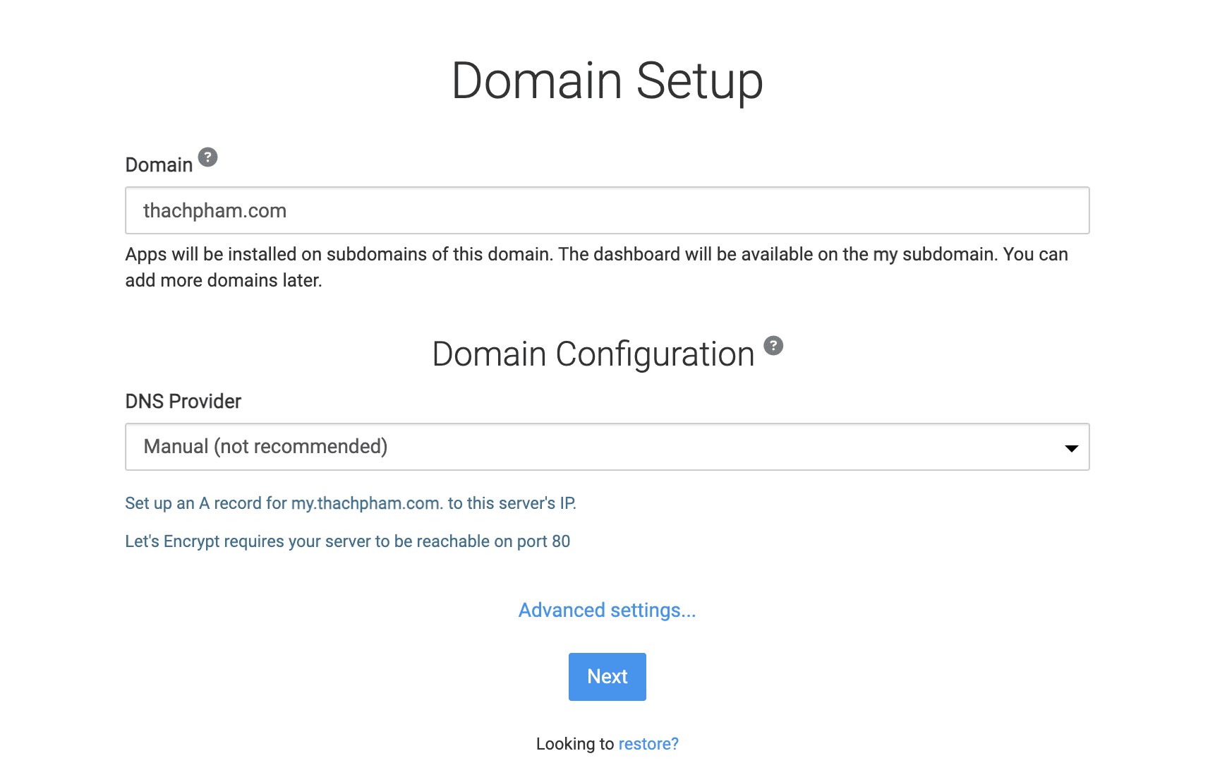 In the DNS Provider section, choose Manual and then create a record for my.tên-miền-của-bạn pointing to the IP address of the server.