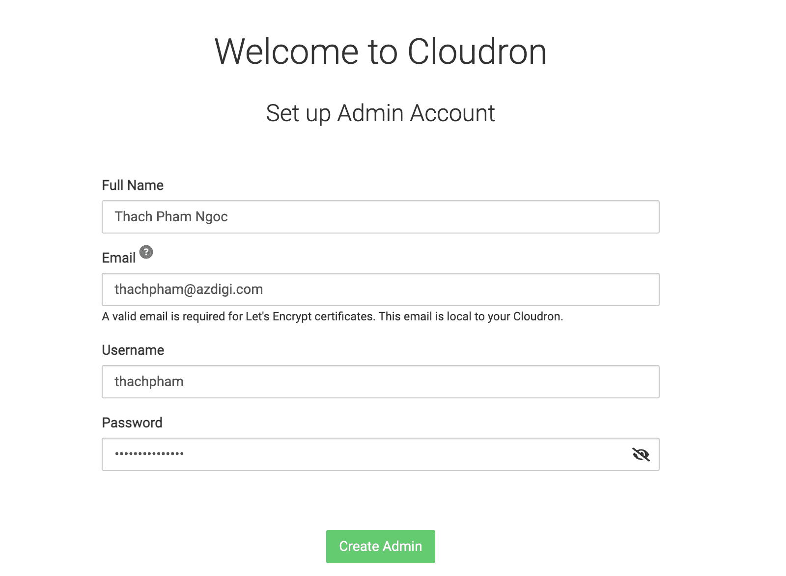 In this step, you will create the highest-level administrative account (Admin) for Cloudron.