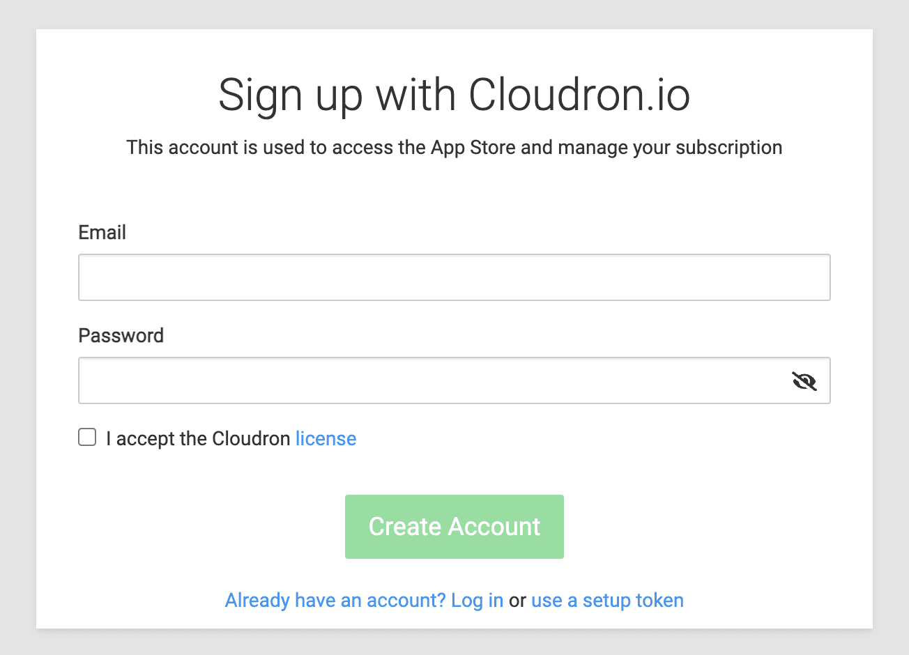Finally, after completing the setup, go to the App Store. Cloudron will prompt you to connect your Cloudron account to the server. You can create an account here and log in to your Cloudron account.