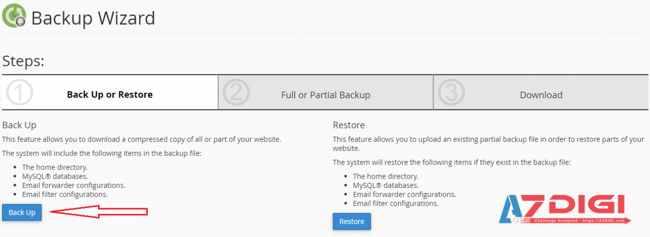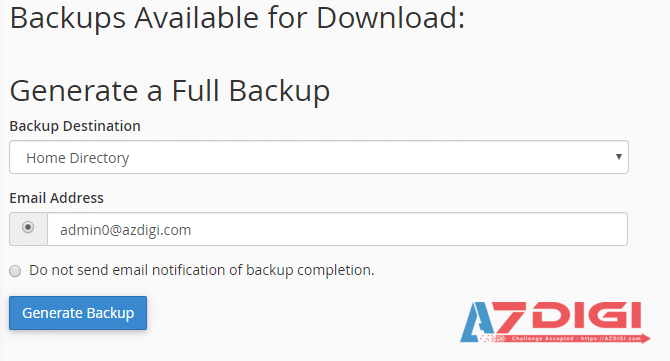 Currently, the Hosting service using cPanel at AZDIGI is supported to save backups of both files and databases in the last 7 days. However, these 7-day backups will only be backed up at a certain time, usually in the middle of the night each day, so if you need to create a backup right now, use the Backup feature in cPanel.