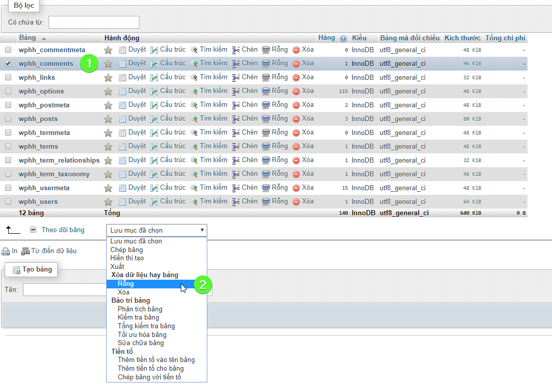 After selecting the database, it will show the tables of that database, you just need to click on the table to be empty and click Empty.