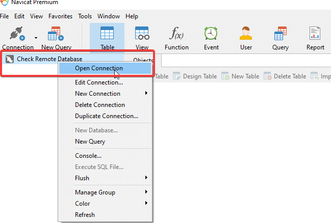 Then you click on the Database Name above and select Open Connection