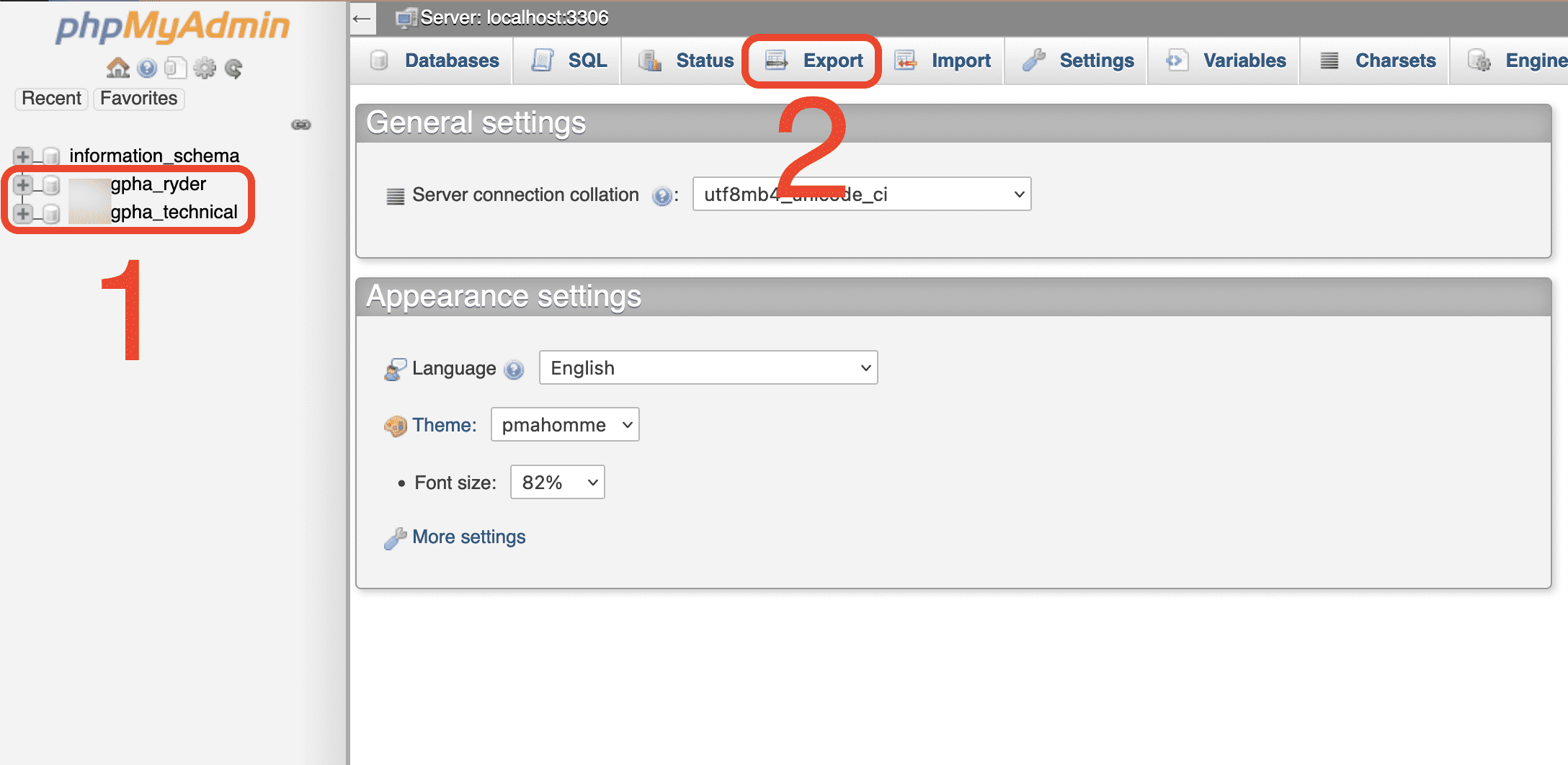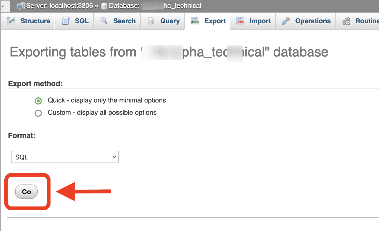 At phpMyAdmin, click on the database you want to download, and then select Export.