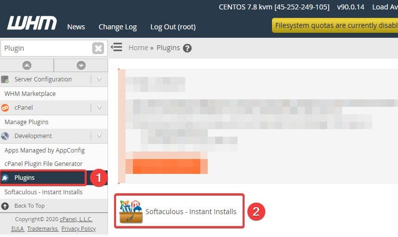 To check Softaculous, at the WHM interface, go to Plugins (1) => Softaculous – Instant installs (2).