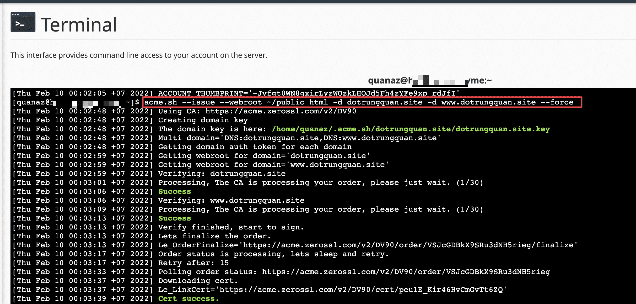 acme.sh --issue --webroot ~/public_html -d dotrungquan.site -d www.dotrungquan.site --force