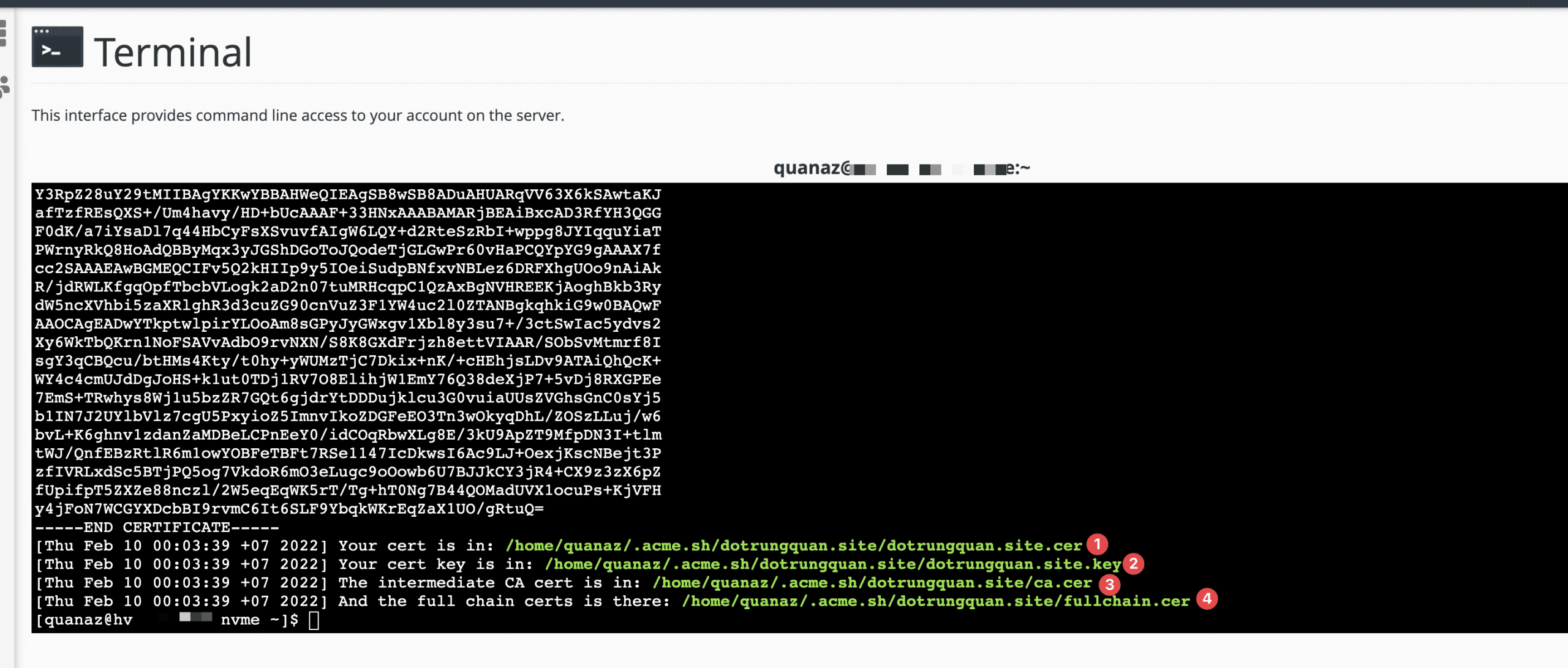 After executing the issue command, you will get the certificate on the screen and 4 certificate file paths, including: