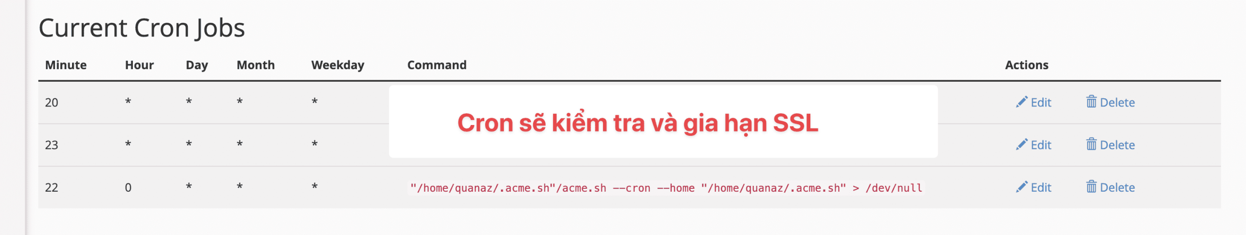 SSL certificate will automatically renew when it expires because ACME installed a cron in the Current Cron Jobs section.