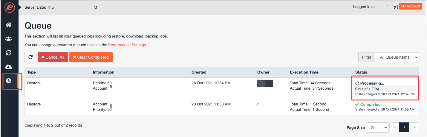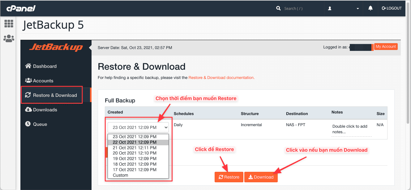 Note: After clicking Restore, you cannot access hosting during the Restore process. Because the system will delete all settings and download the old Backup to perform, depending on the size of your data, the completion time will vary. After the Restore is complete, please access Queue to check.