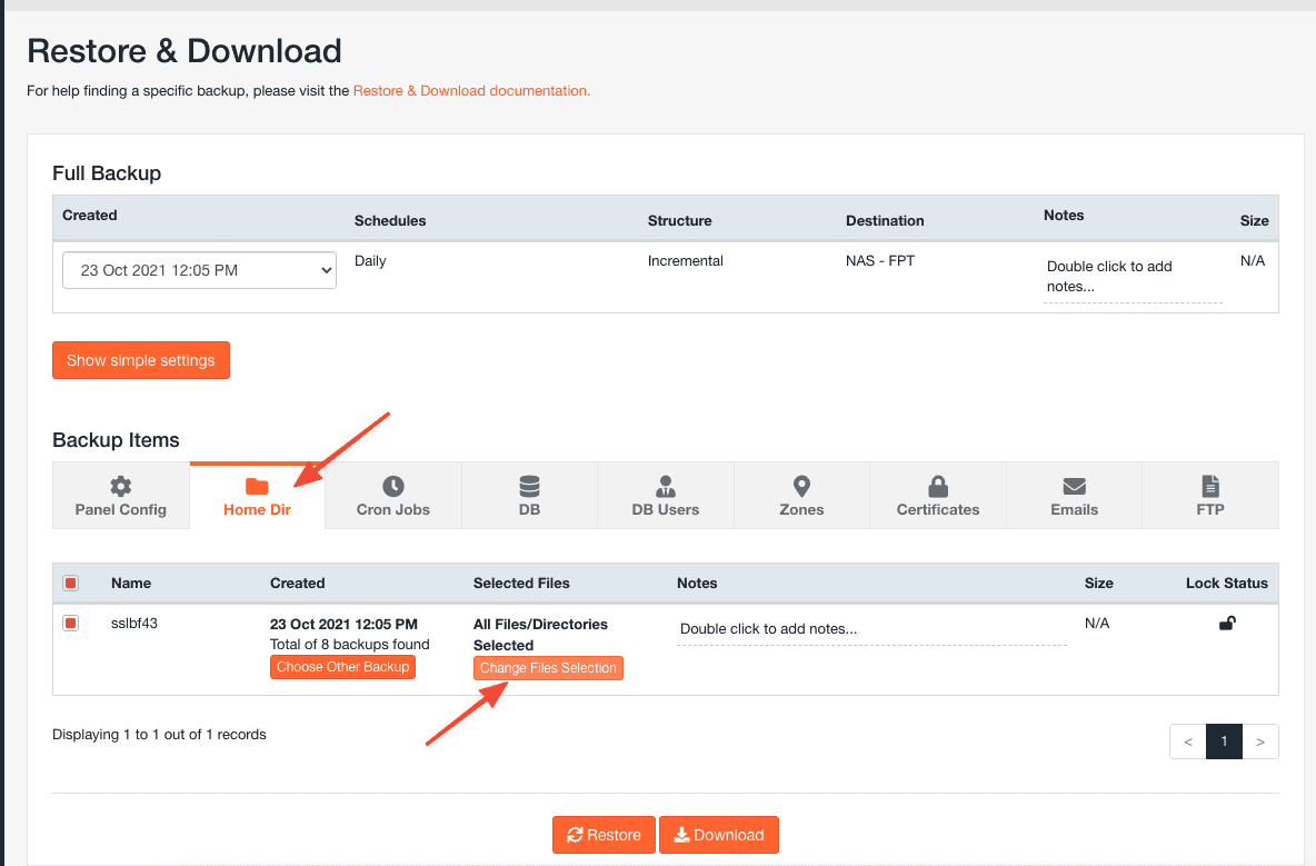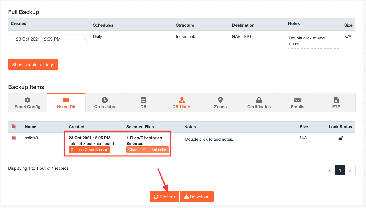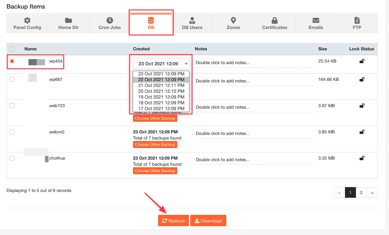 When you click on Restore & Download, you will see the Created section, click on it to select the backup you want to restore. After you have chosen the time, click Restore.