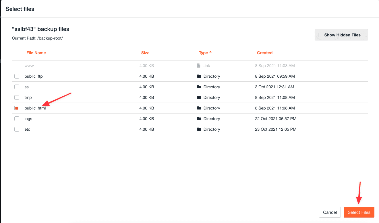 The system will display all the Folders and Files, you need to tick the file or folder you want to Restore => Select Files