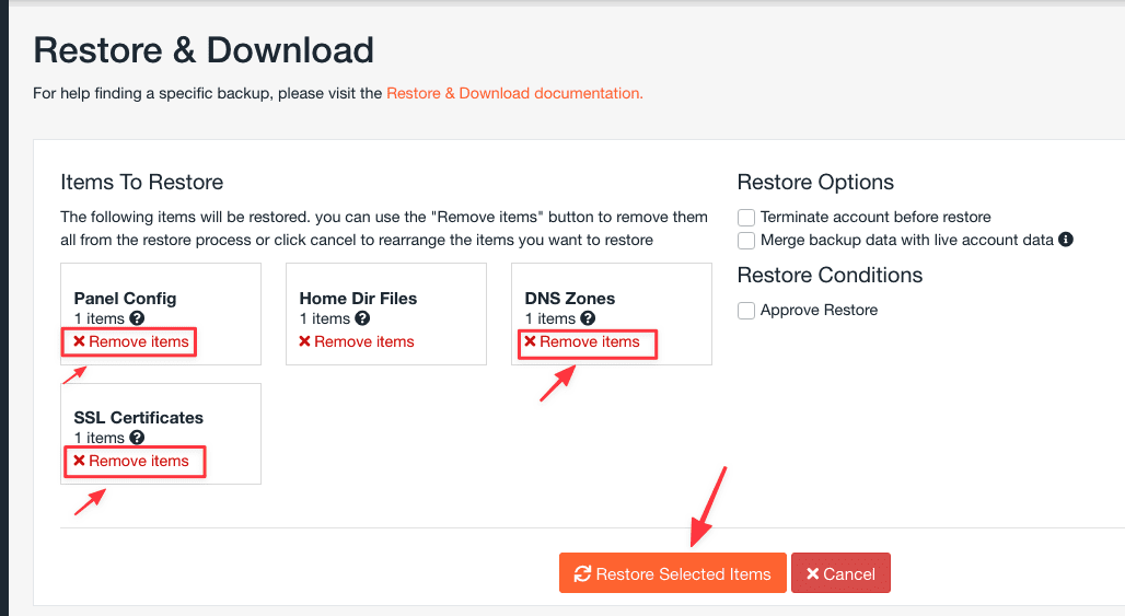 In the Restore window, delete all Items and leave only Home Dir Files, then click Restore Selected Items