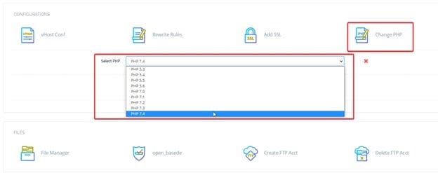 At the menu, you click Change PHP => Select the PHP to change (you can fully customize the PHP versions from 5.3 => 7.4) => click Change PHP.