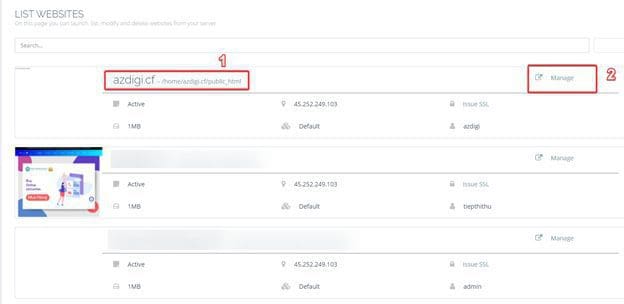 This section will show the existing websites on the VPS, you need to customize PHP for any website, then click Manage the corresponding website of that website.