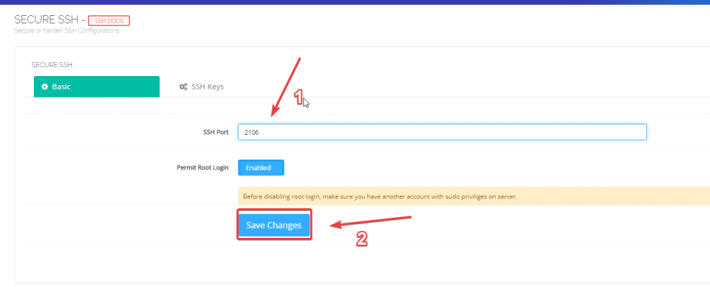 In the Basic tab, to change the port, enter the port you need to change in the SSH Port box (1) => Here I enter port 2106 => Save changes (2)