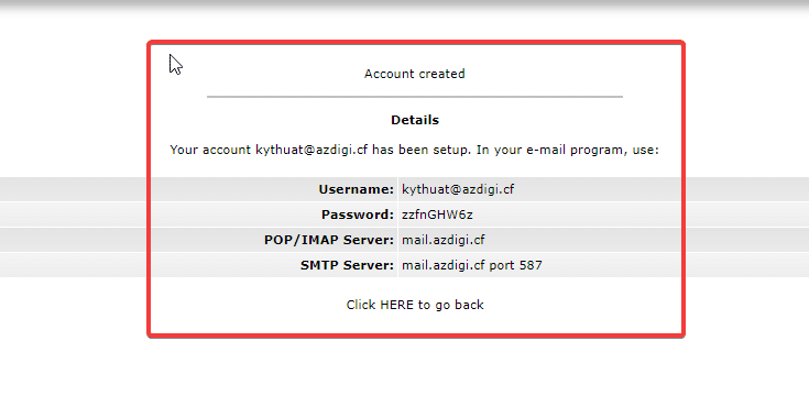 As shown below, the email has been successfully created, you can save this information.