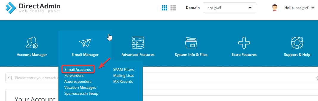 At the DirectAdmin administration interface, click E-mail Manager => E-mail Accounts.