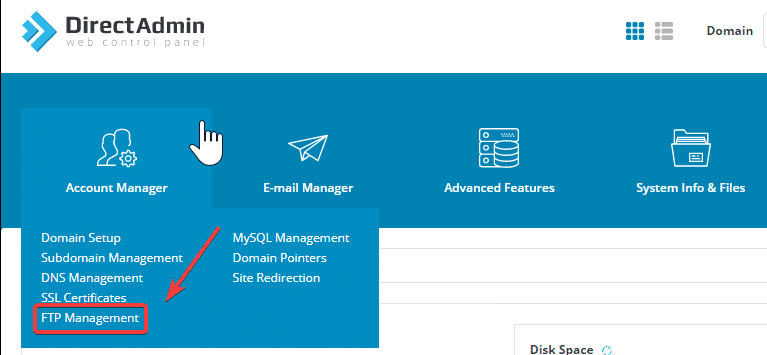 First, log in to DirectAdmin => go to Account Manager => FTP Management.