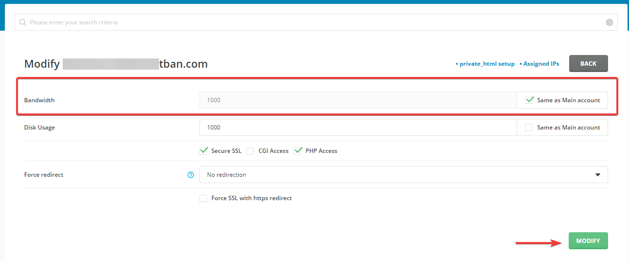 You click on the domain and reset this parameter, as shown below, I set unlimited for this website. Next, click MODIFY để execute.