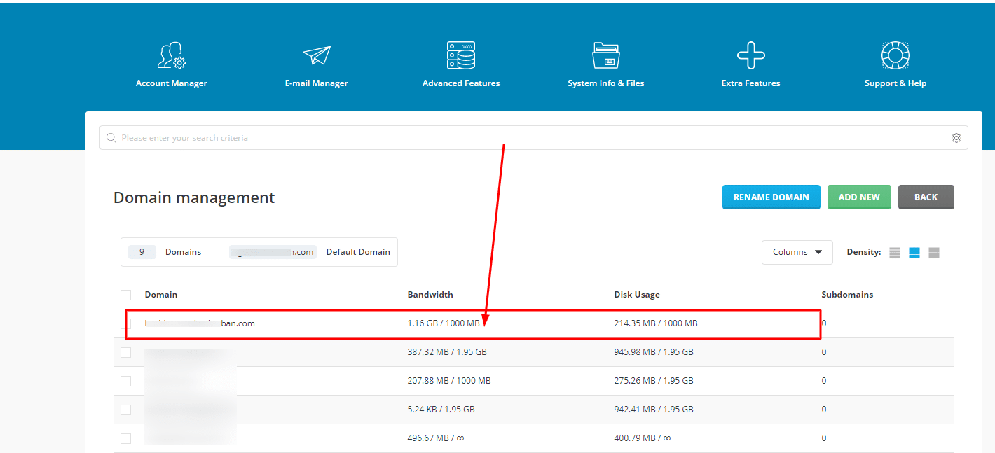 Here, you will see that the domain is using excess bandwidth. In the picture below is 1.6GB / 1GB