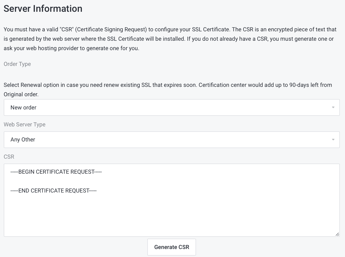 Next, select New order if it is a new registration, and if it is a renewal, select Renewal. For example, I have a new registration, so I choose New order and Any Other for Web Server Type, so your webserver is not IIS. After choosing, click Generate CSR.