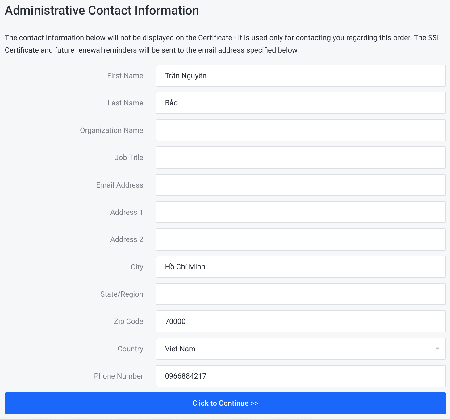 Then scroll down, fill in some administrator information and select Click to Continue.