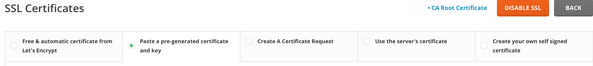 At this interface, select Paste a pre-generated certificate and key to install the purchased SSL.
