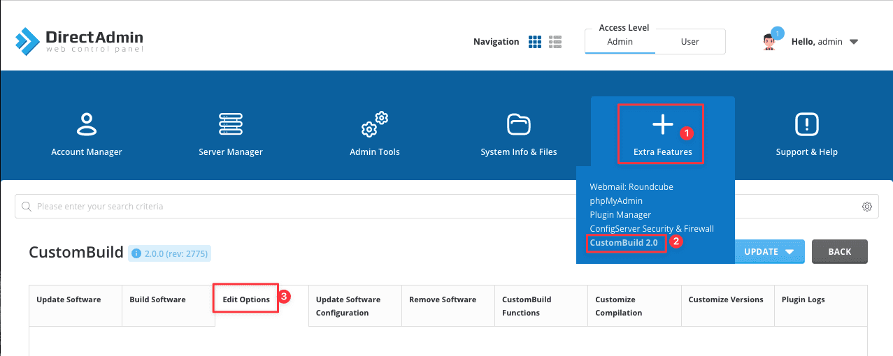 There are many interfaces on DirectAdmin, but the functions are exactly the same. So you just need to go to Extra Features => Custom Build 2.0 => Edit Options as shown below: