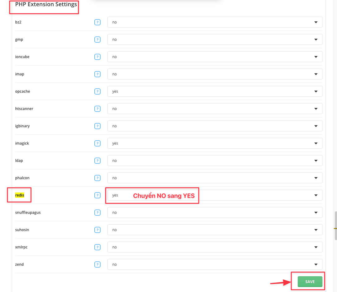 In the PHP Extension Settings section, find the Redis line and switch from No to Yes => click Save.