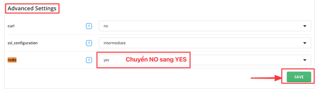 You scroll down to the Advanced Settings section, you will see a line that is Redis, you also switch from No to Yes => click Save to save the changes.