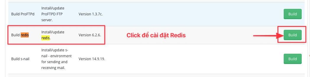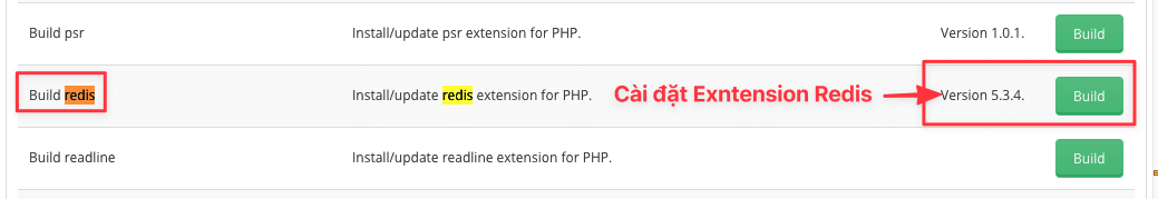You can understand Extension php is the driver to connect to the application. To install, go to Install/update PHP extensions and find the line Build redis (Install/update redis extension for PHP) => click Build to start installing Redis extension php.