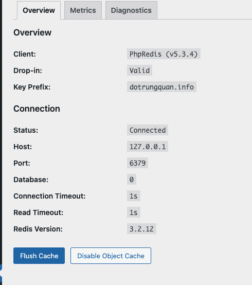 After successfully installing Redis and Redis PHP Extension on the server, you can use the Plugin named Redis Object Cache to connect as follows: