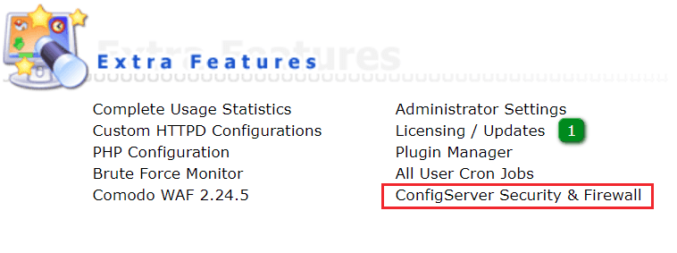 Once logged in within DirectAdmin, find the ConfigServer Security & Firewall function. (you can find it in the Extra Features menu or use the search box)