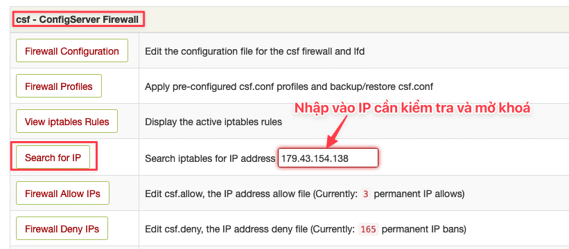 After entering ConfigServer Security & Firewall, go to the Search for IP section, enter the IP you want to open and press the Enter button on the keyboard.