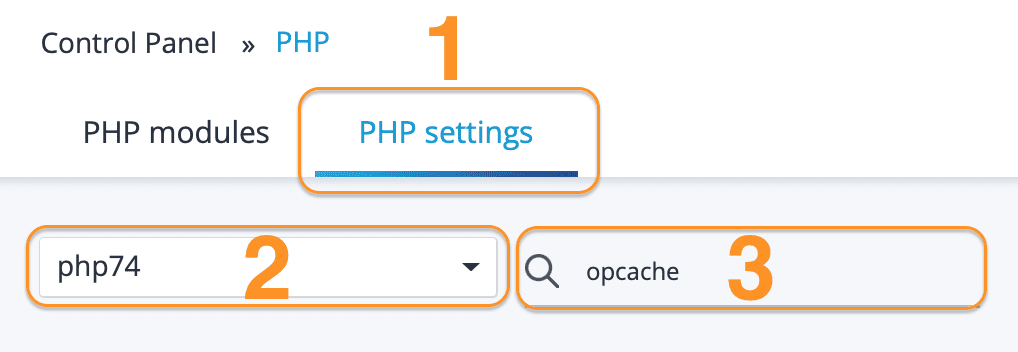 In this section, you select PHP Settings(1). => select the PHP version you use (2) and search with the keyword: opcache.