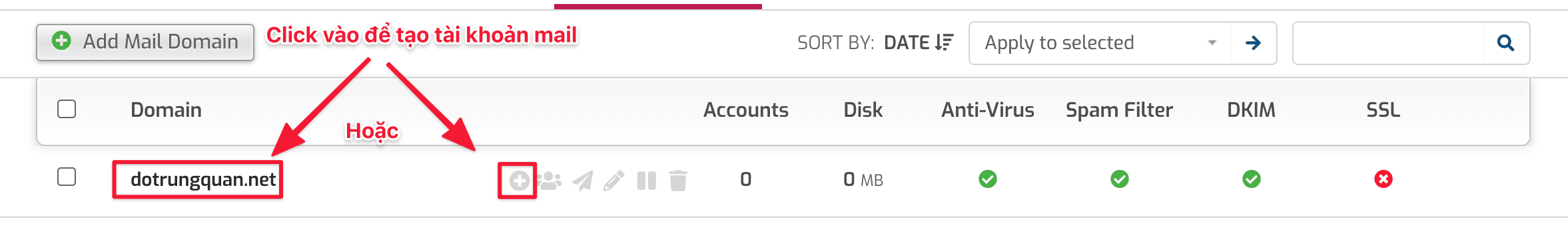 Next, you access the newly added domain name by clicking on the Domain name or the + icon as shown below: