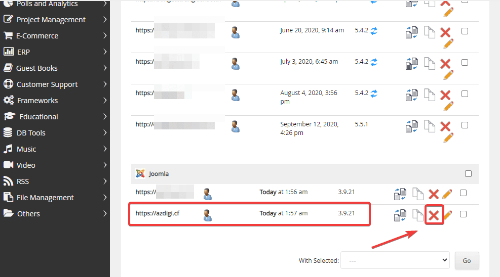 At the Softaculous interface, you will see the websites that have been installed through Softaculous, you find the website to be removed and click the corresponding X, as shown below: