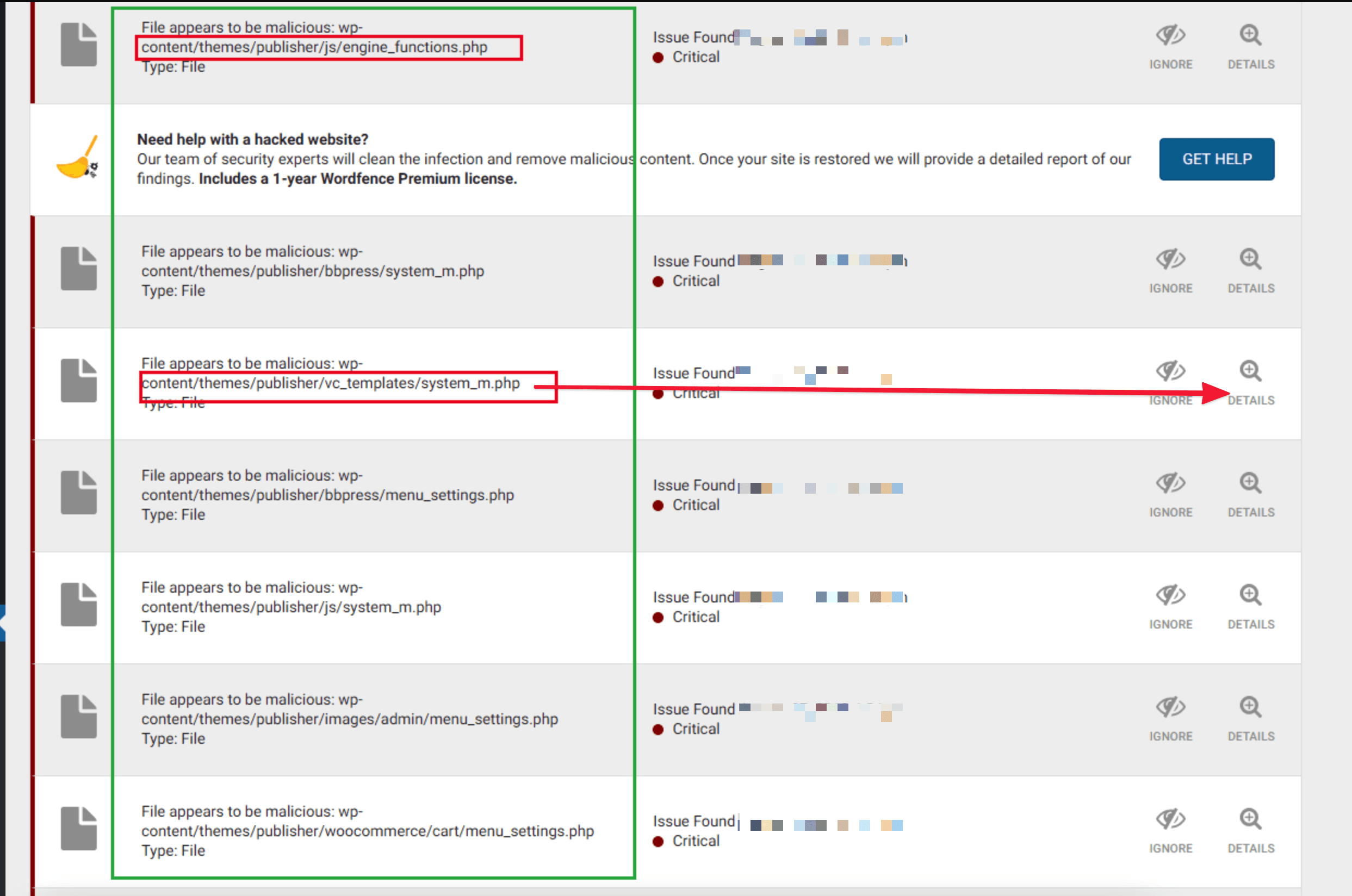 When detected malicious code you will see as shown below, the plugin specifies the infected files with the path. To see the details, click on DETAILS to see the details in the infected file.