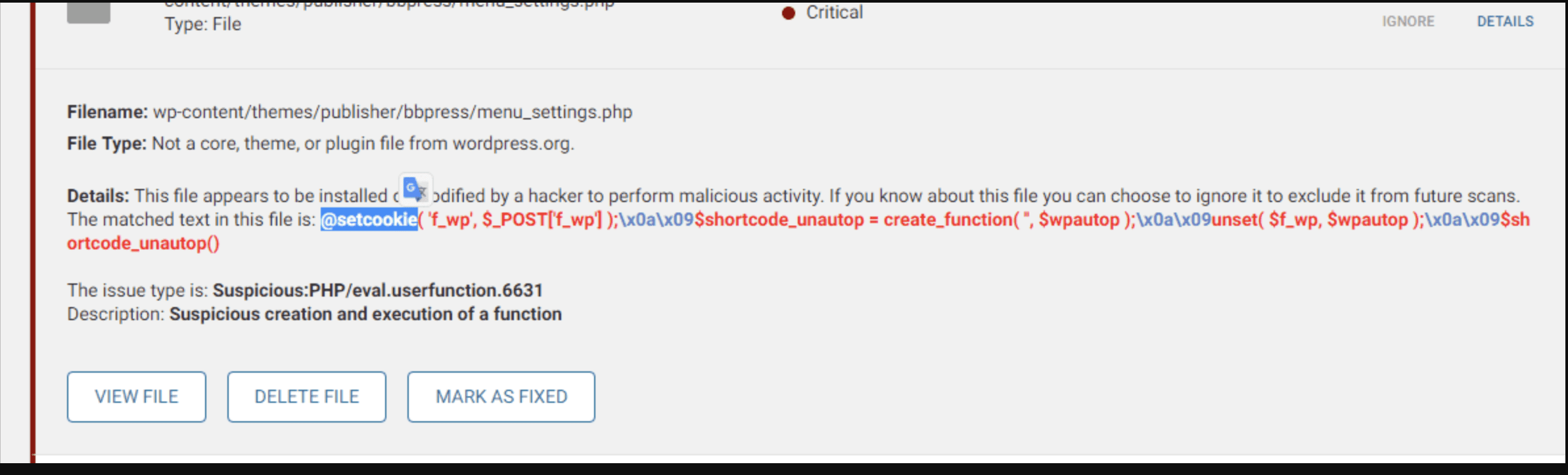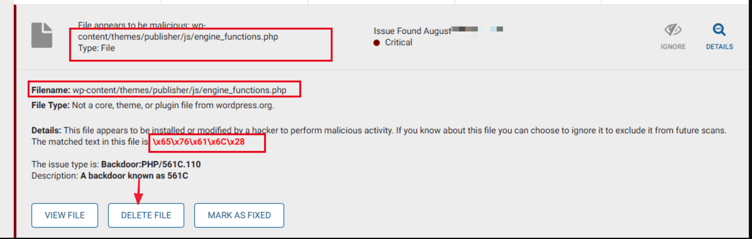The DETAILS section will show the string of malicious code inserted by the virus. Select DELETE FILE if you want to remove this file from the website.