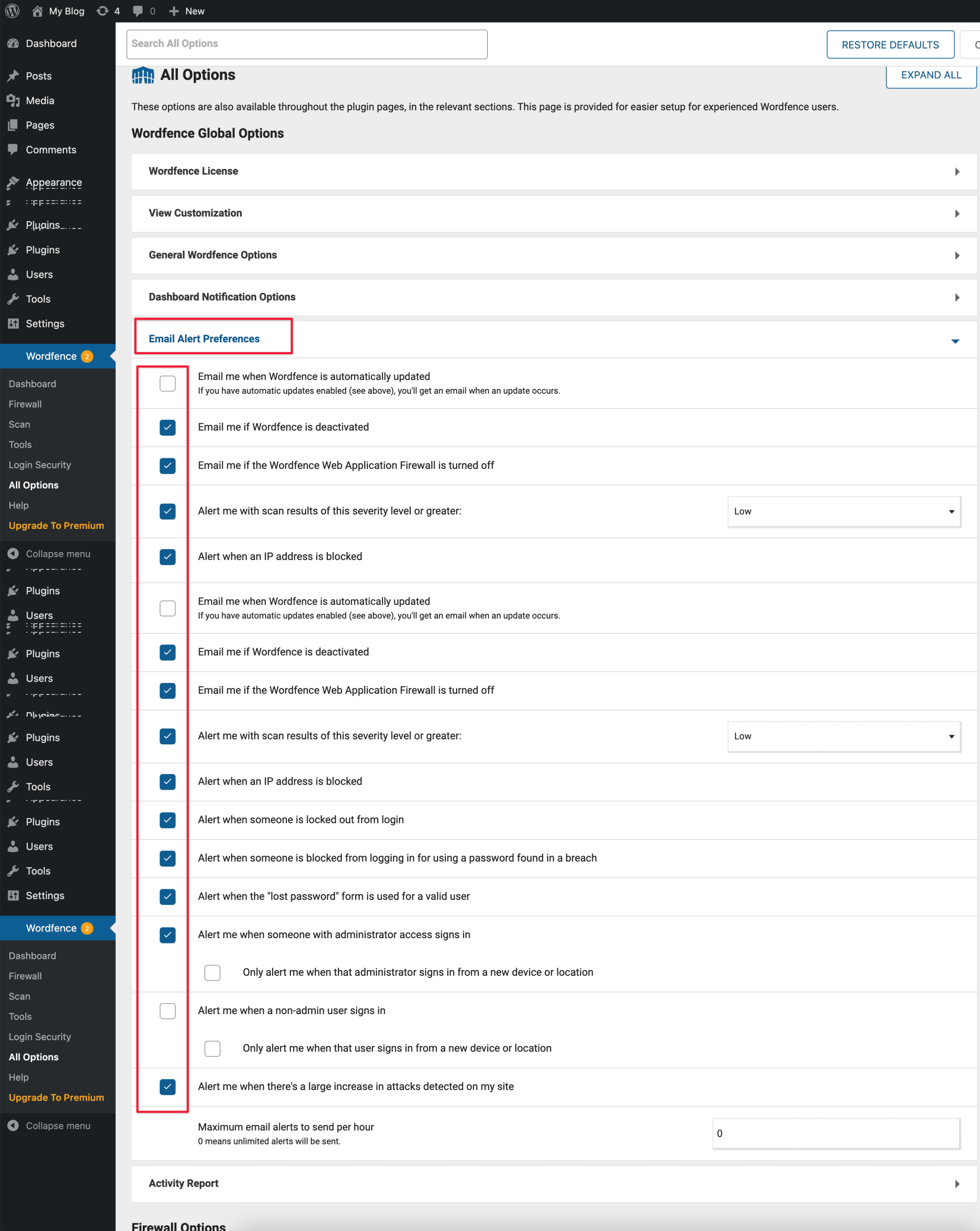 Click Wordfence => All option => Email Alert Preferences