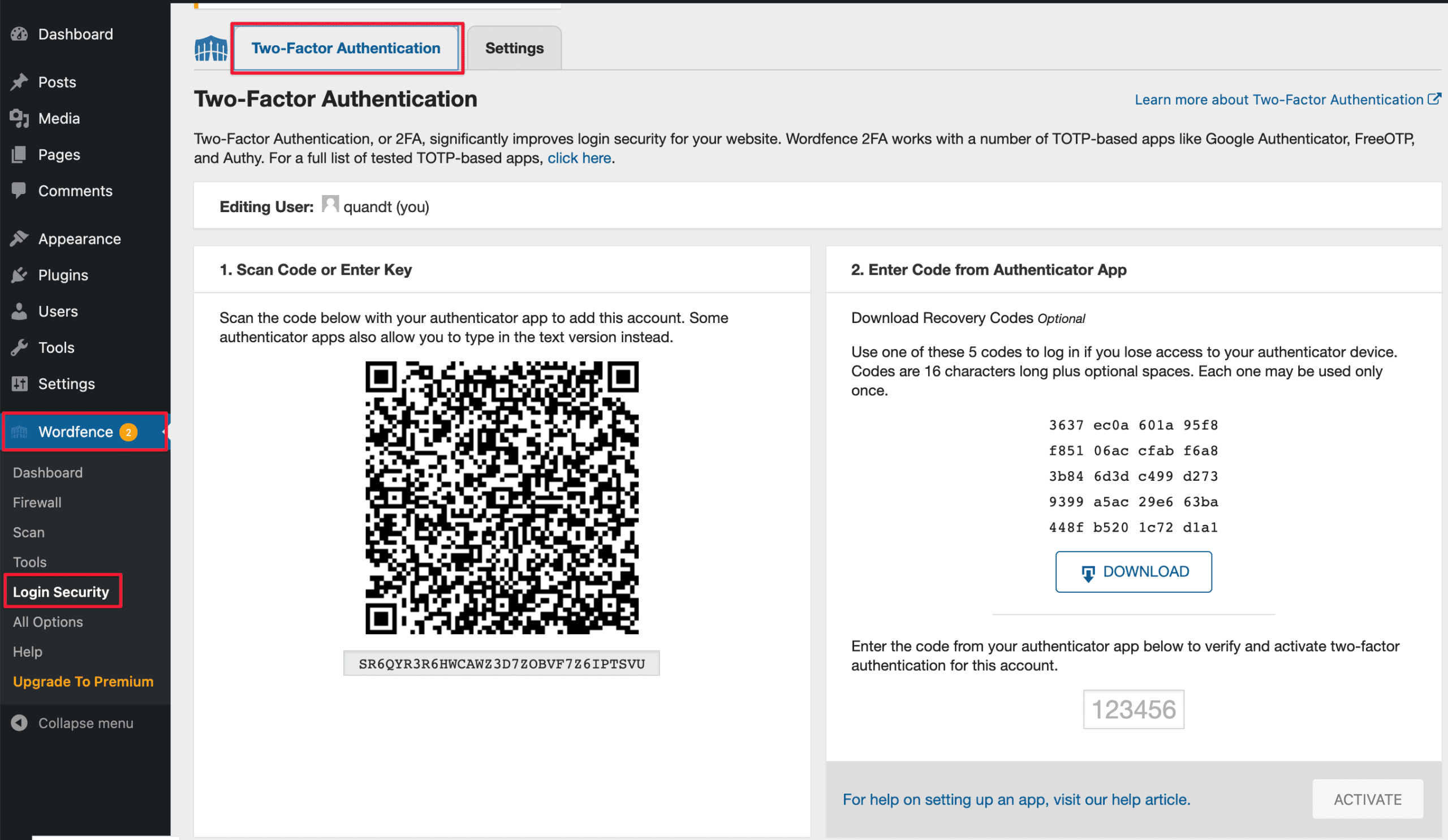 Go to Wordfence => Login Security => Two-Factor Authentication. You can use a QR code to set up for 2-factor verification or a Backup Code.