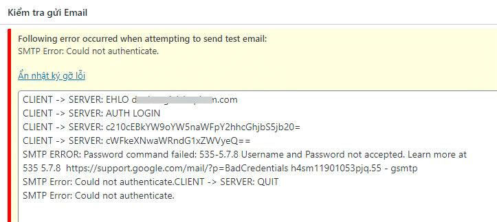 There will be some cases where you have correctly configured email and full SMTP information, but when test mail still cannot be sent and the error log is similar to the image below: