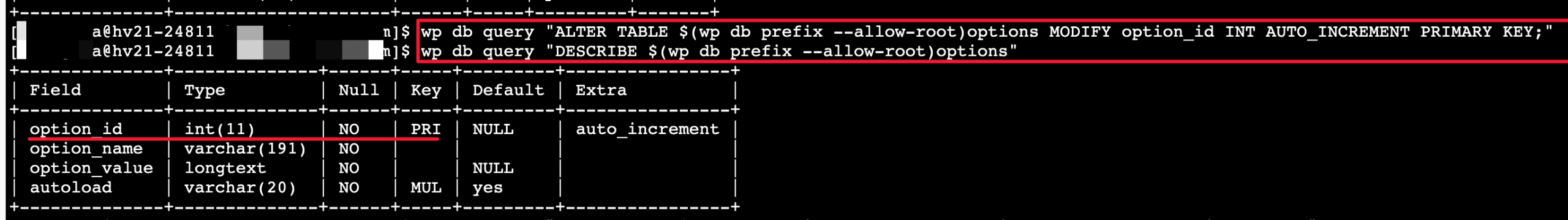 Once the identified primary key is lost, update the primary key for the option_id column with the wp-cli command as follows: