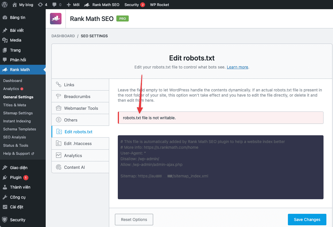 Recently AZDIGI has supported customers to handle an error case recorded on the Rank Math Plugin that is the error of not being able to edit the robots.txt file and the error message robots.txt file is not writable as shown below: