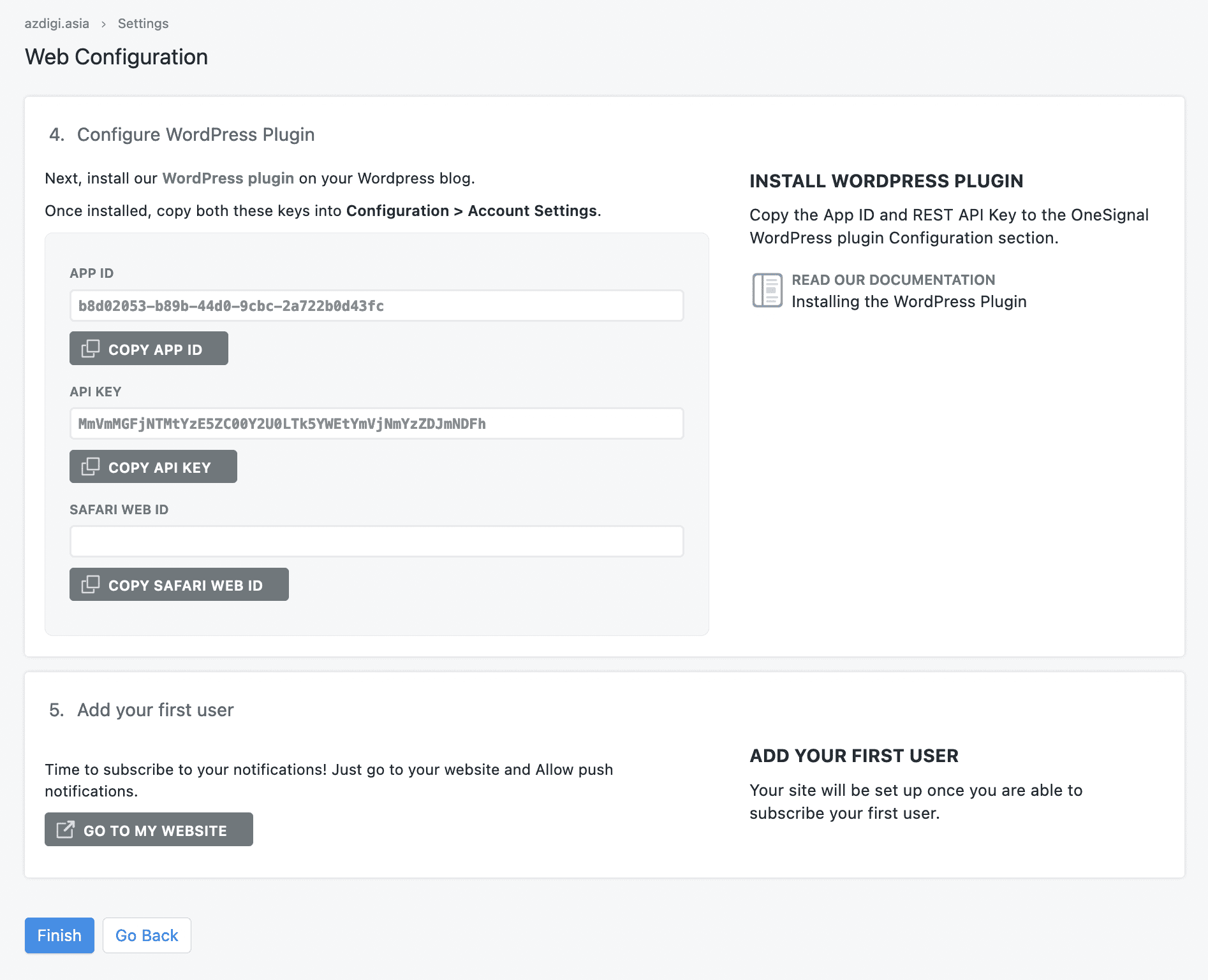 After installing and activating the plugin, go to WordPress admin > OneSignal Push > Configuration. Here, find the fields: App ID, API Key and copy the 2 information from OneSignal’s website. Then drag to the bottom to save.