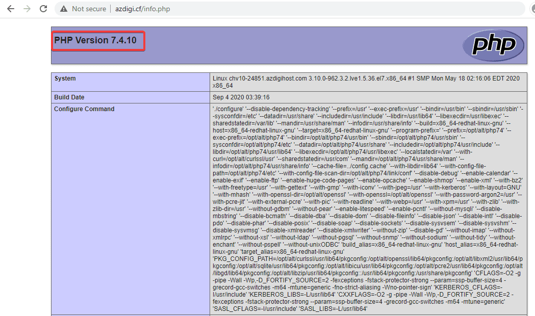 You go to the browser and access the link created in step 1 (https://azdigi.cf/info.php) to check if the PHP version has been upgraded successfully. As shown below, the PHP version has been successfully upgraded to 7.4.