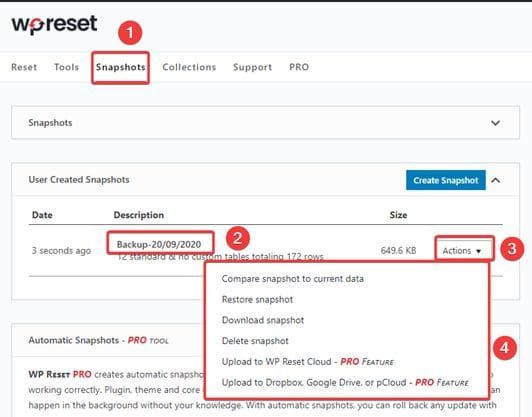 Next, at WP Reset’s interface, click on the Snapshots tab (1) => Create Snapshot (2) => Set a name for Backup (3) => Create snapshot (4).
