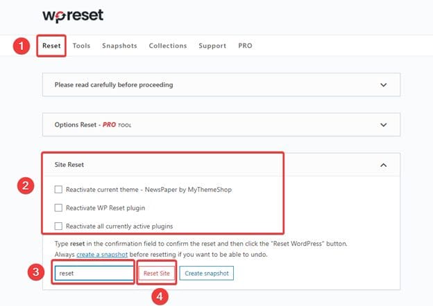 After selecting the option in part (2) is complete, you need to enter the word reset in (3) and press Reset Site (4).