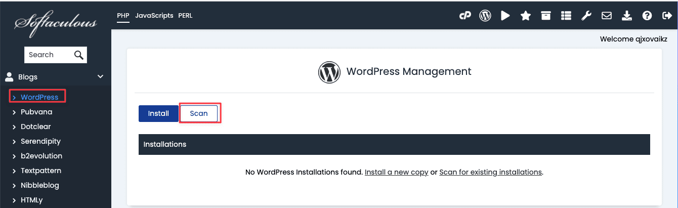 At the interface below, click Blogs => WordPress => Scan to scan and search for WordPress websites on your host.